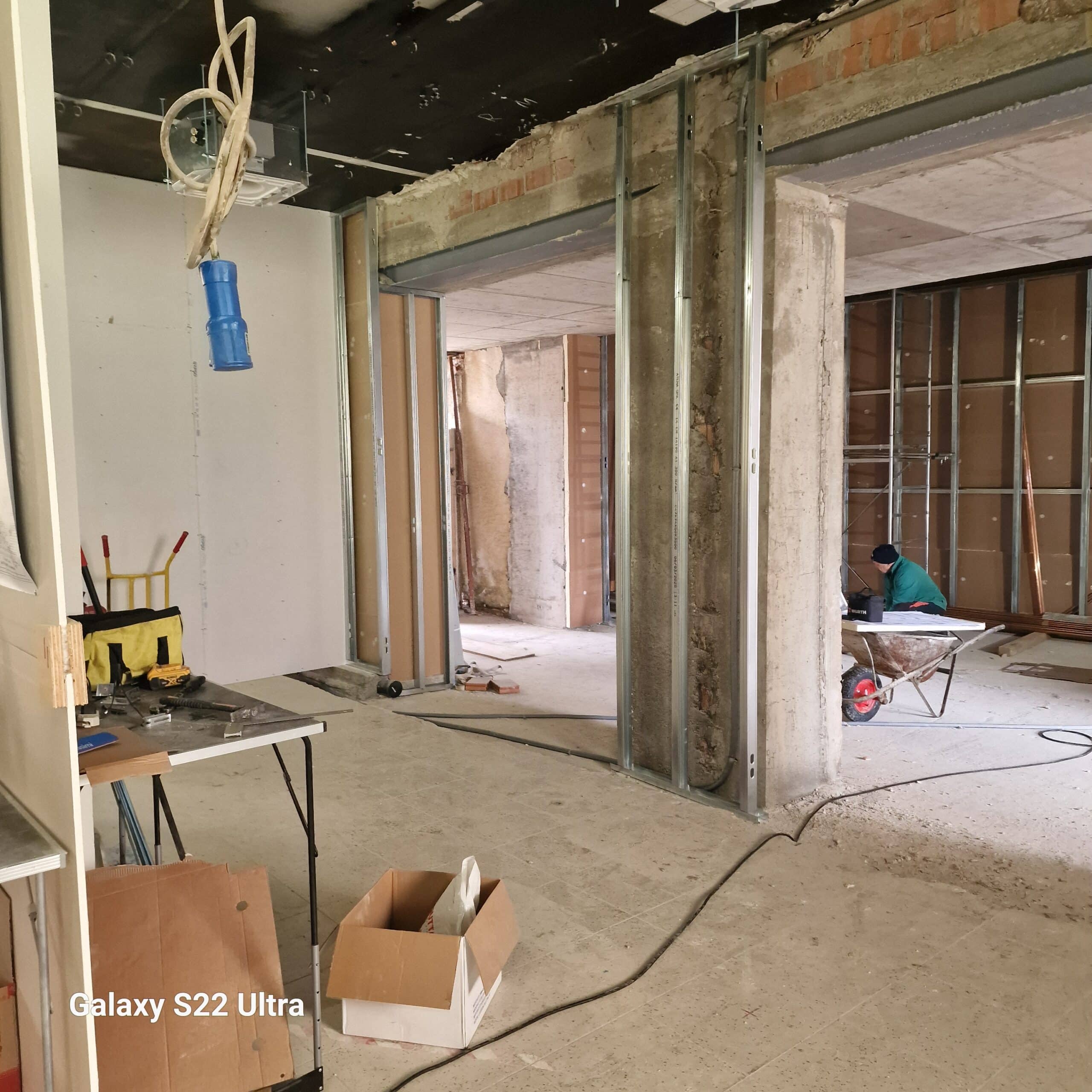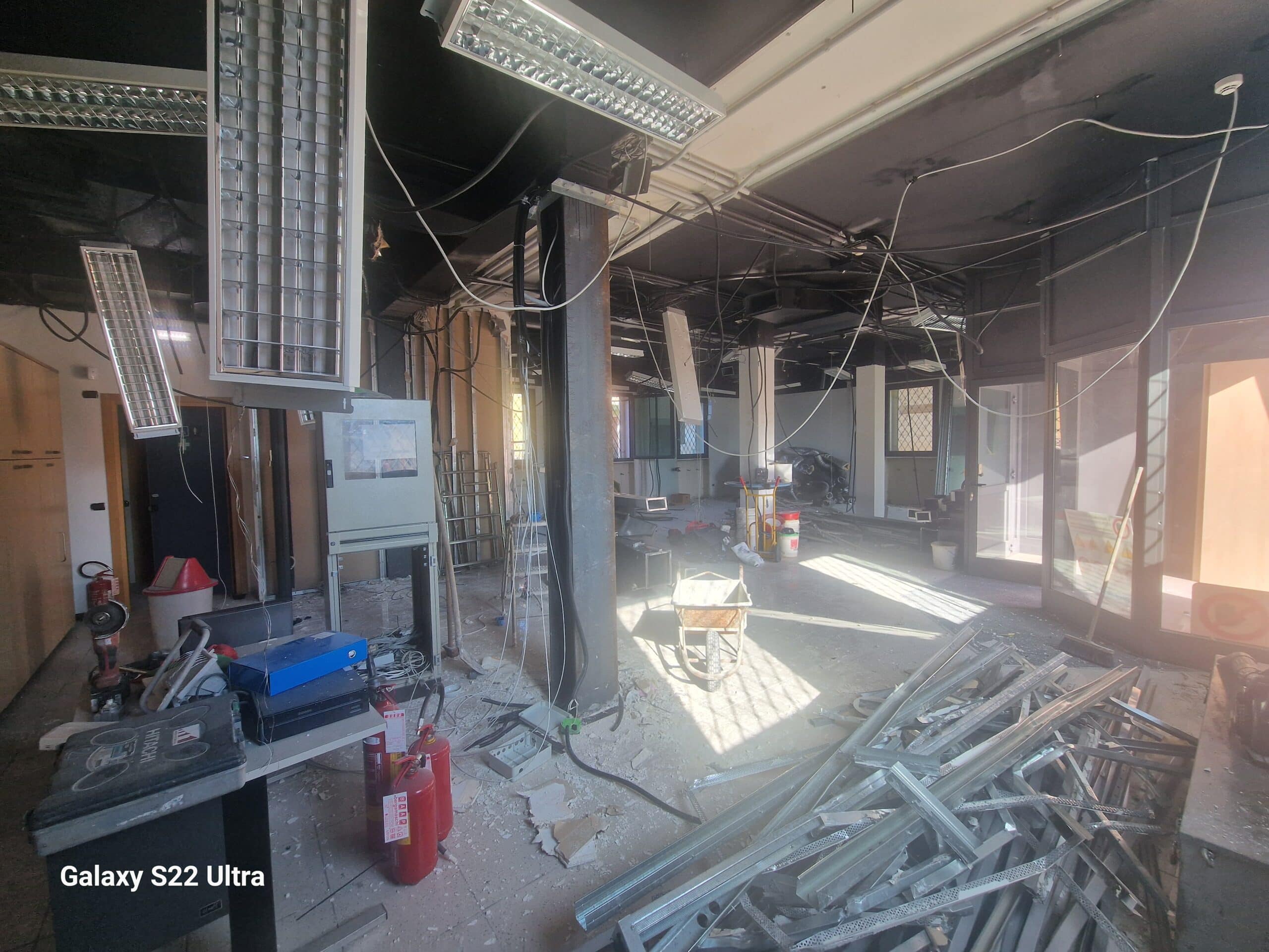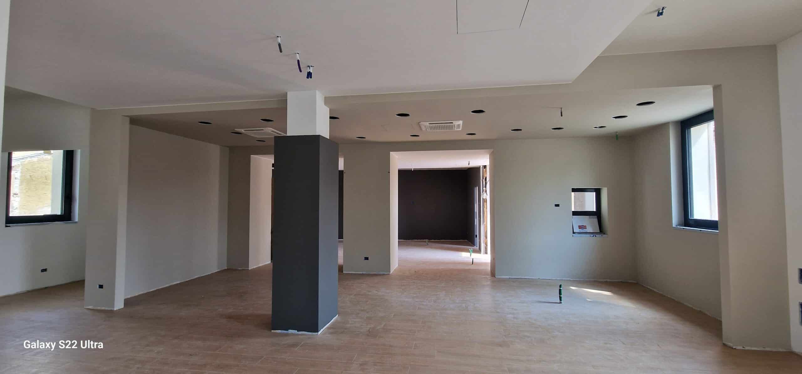 Le compartimentazioni interne sono realizzate in cartongesso, come anche il controsoffitto al piano terra, il tutto pensato per facilitare l’installazione degli impianti tecnologici necessari, realizzati tutti ex novo per dare ai nuovi ambienti uno stile accogliente e moderno.