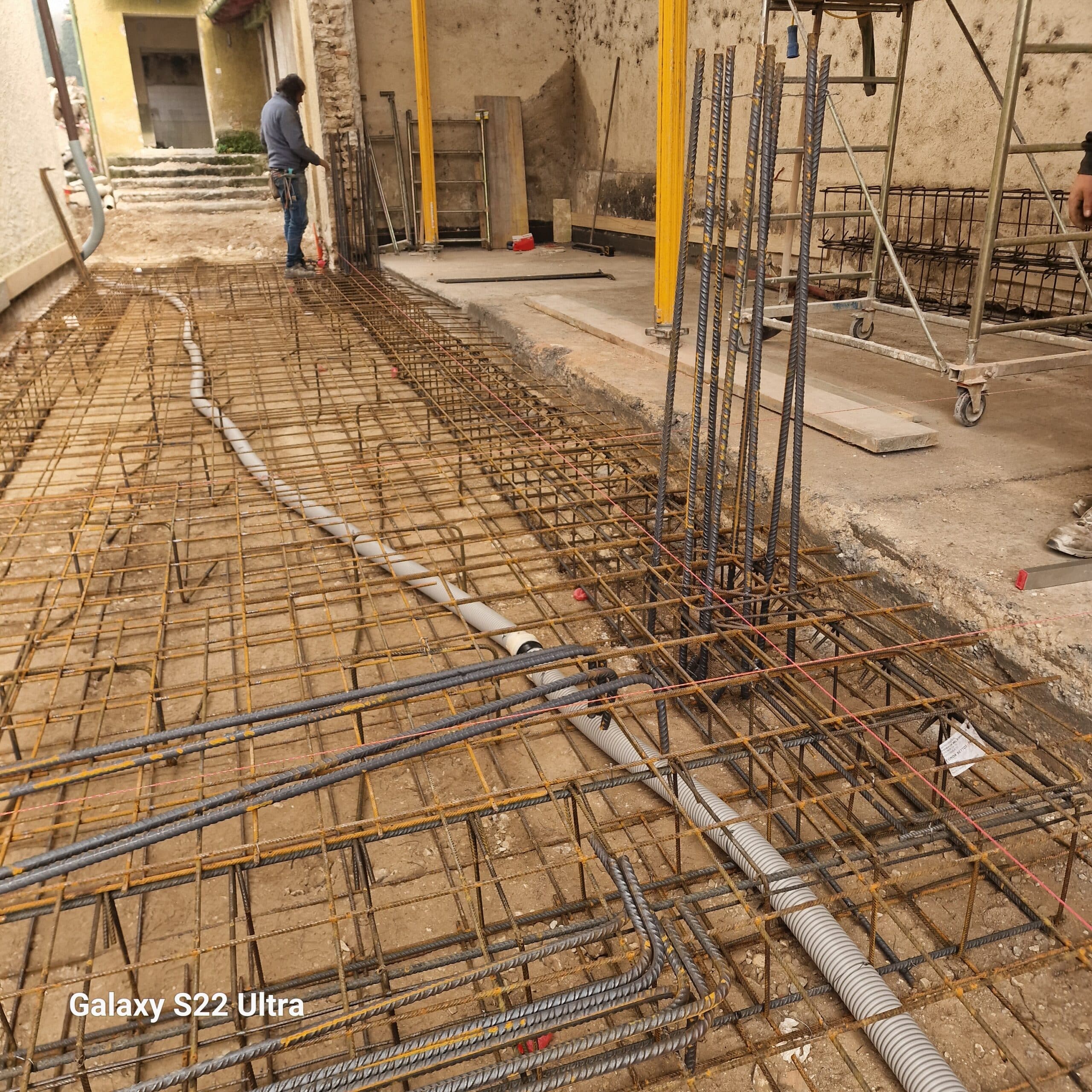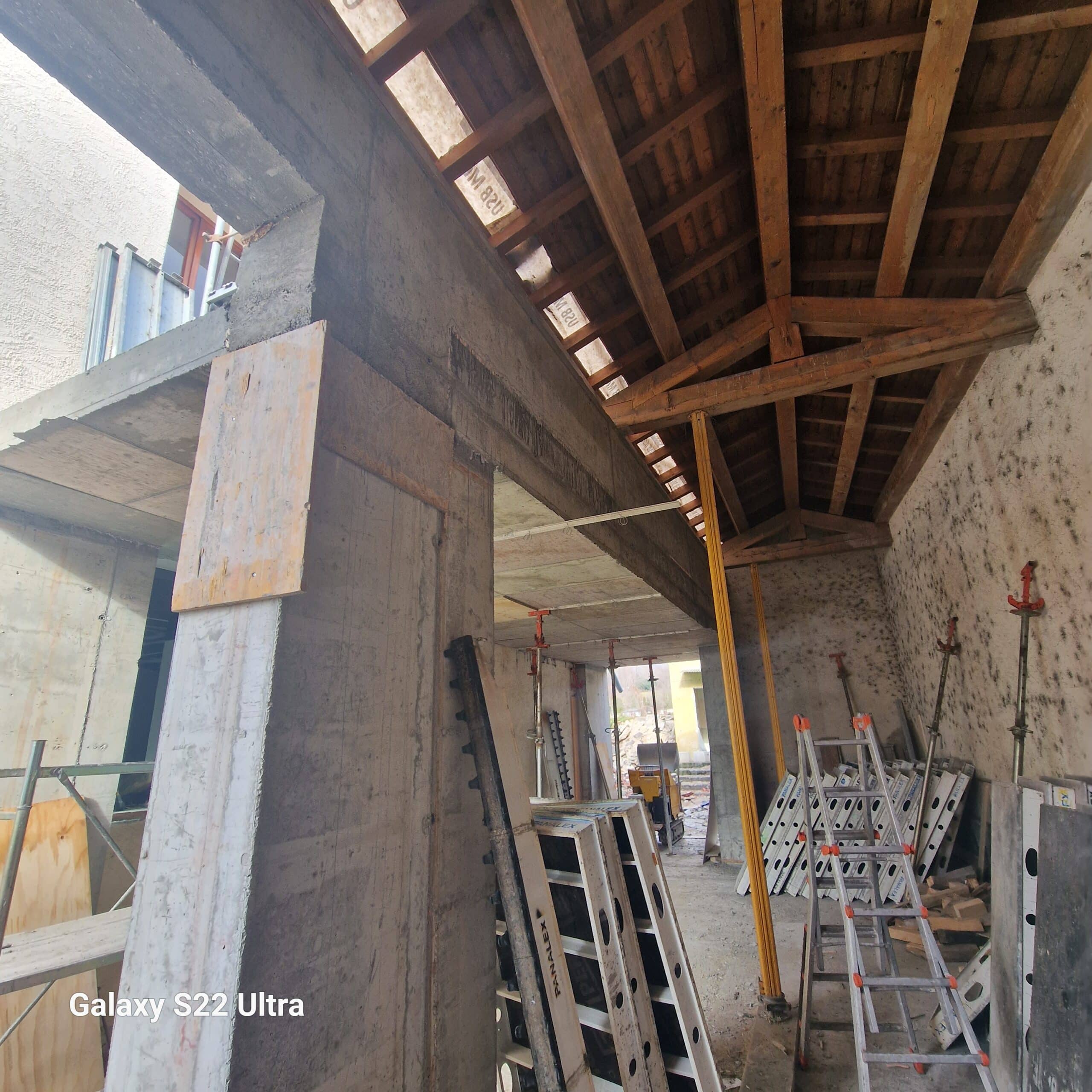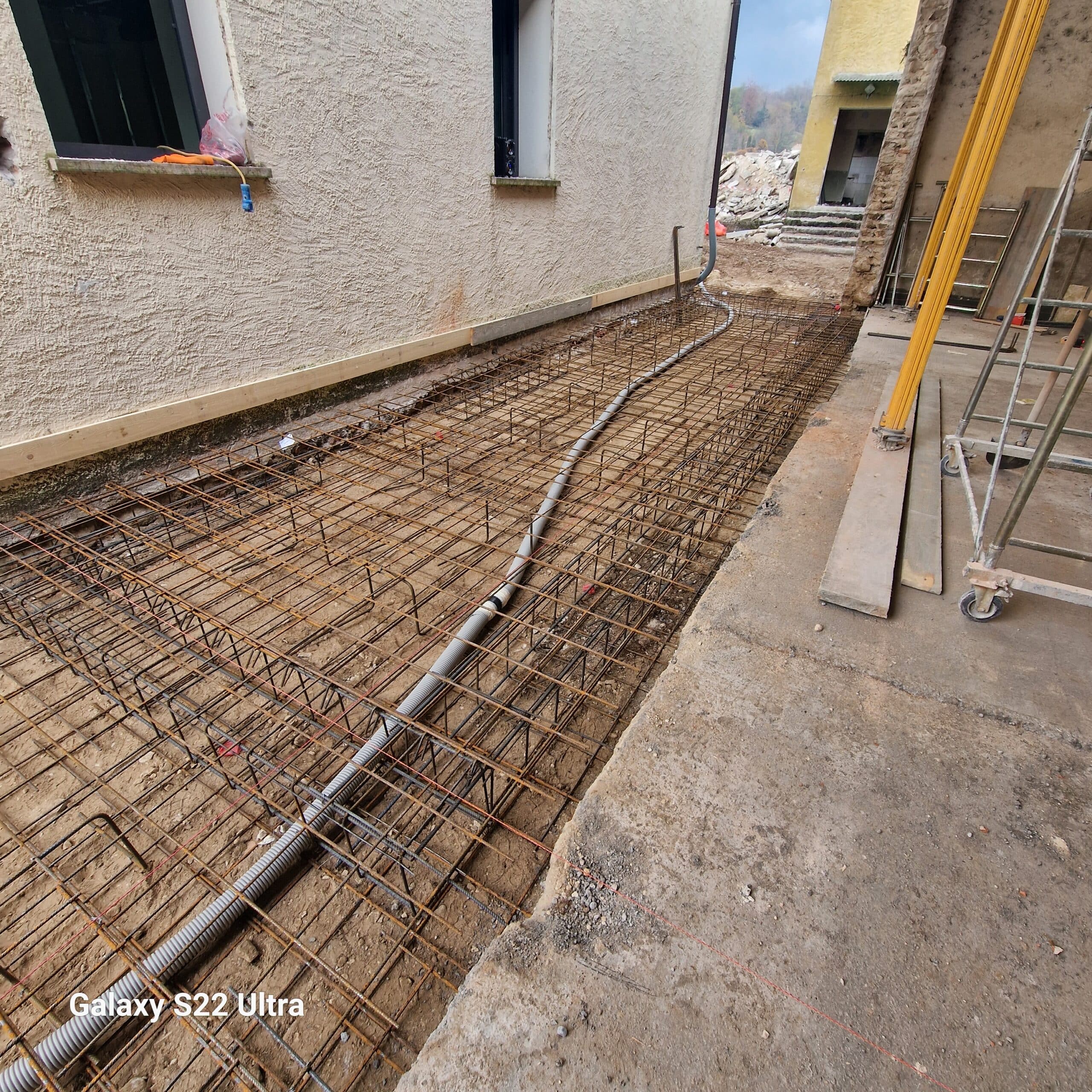 L’ampliamento e stato realizzato in opera mediante armatura e getto di strutture in c.a. per la realizzazione delle fondazioni a platea, dei pilastri, travi e della soletta di copertura. Particolare attenzione è stata data alle opere in c.a. in quanto i tre corpi di fabbrica sono stati mantenuti indipendenti l’uno dall’altro mediante giunti tecnici strutturali, e la realizzazione di una doppia travatura per suddividere il carico, da una parte della soletta in c.a. e dall’altra del tetto del portico esistente.